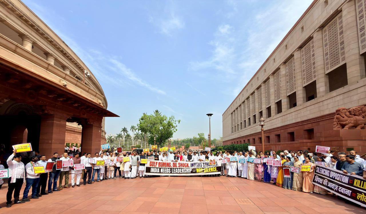 पश्चिम एशिया संघर्ष को लेकर संसद परिसर में विपक्ष का प्रदर्शन